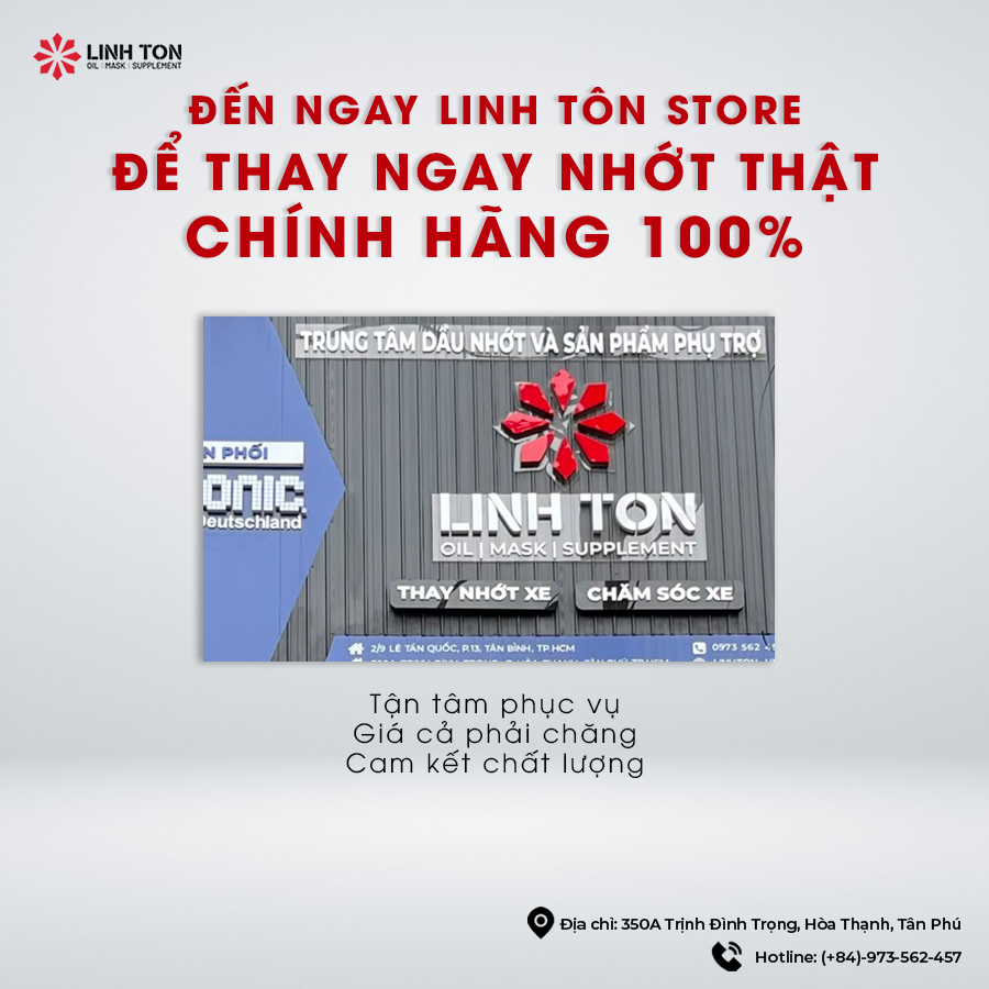 Đến ngay Linh Tôn Store – Trung tâm chăm sóc xe toàn diện chuyên cung cấp dầu nhớt, phụ tùng và sản phẩm phụ trợ chính hãng tại 350A Trịnh Đình Trọng, Hòa Thạnh, Tân Phú để được thay nhớt thật chính hãng 100%. Tại đây chúng tôi có đội ngũ tư vấn và kỹ thuật lành nghề, giàu kinh nghiệm hỗ trợ khách hàng mọi lúc. Khách hàng có thể tham khảo tại website của chúng tôi hoặc liên hệ hotline (+84)-973-562-457 để biết thêm thông tin chi tiết và hỗ trợ ngay hôm nay.
