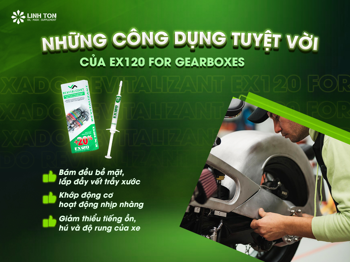 - Không chỉ giúp phục hồi, EX120 gearbox còn giúp tiết kiệm xăng tối đa (đặc biệt là đối với các loại xe ôtô và xe tay ga) bằng cách giảm thiểu tiếng ồn, tiếng hú và độ rung của xe lên đến 10 lần, đồng thời cải thiện độ mượt mà khi sang số. Điều này làm cho XADO REVITALIZANT EX120 trở thành một loại phụ gia đặc biệt quan trọng cho các chủ xe muốn giữ cho xe của họ hoạt động tốt hơn.