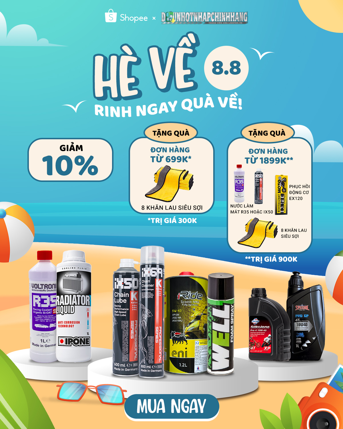 - Đơn hàng từ 1 triệu 899 nghìn đồng: Nếu bạn quyết định đầu tư hơn với đơn hàng từ 1 triệu 899 nghìn đồng, chúng tôi sẽ tặng bạn lựa chọn giữa nước mát R35s trị giá 345.000đ hoặc Dưỡng sên cao cấp Ix50 Jumbo trị giá 345.000đ, kèm theo Hồi phục động cơ Ex120 trị giá 250.000đ và 8 khăn lau siêu sợi - tổng giá trị lên đến 900.000đ.