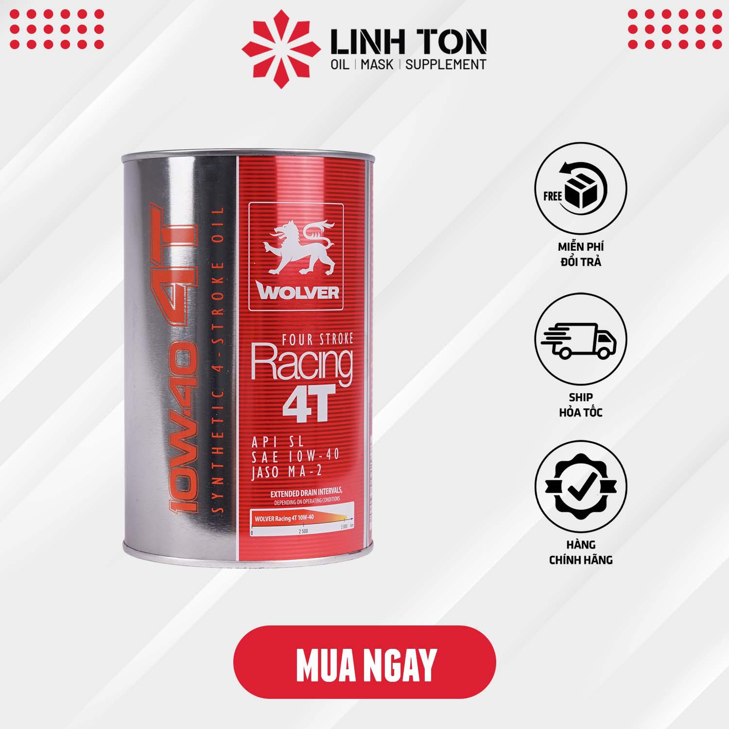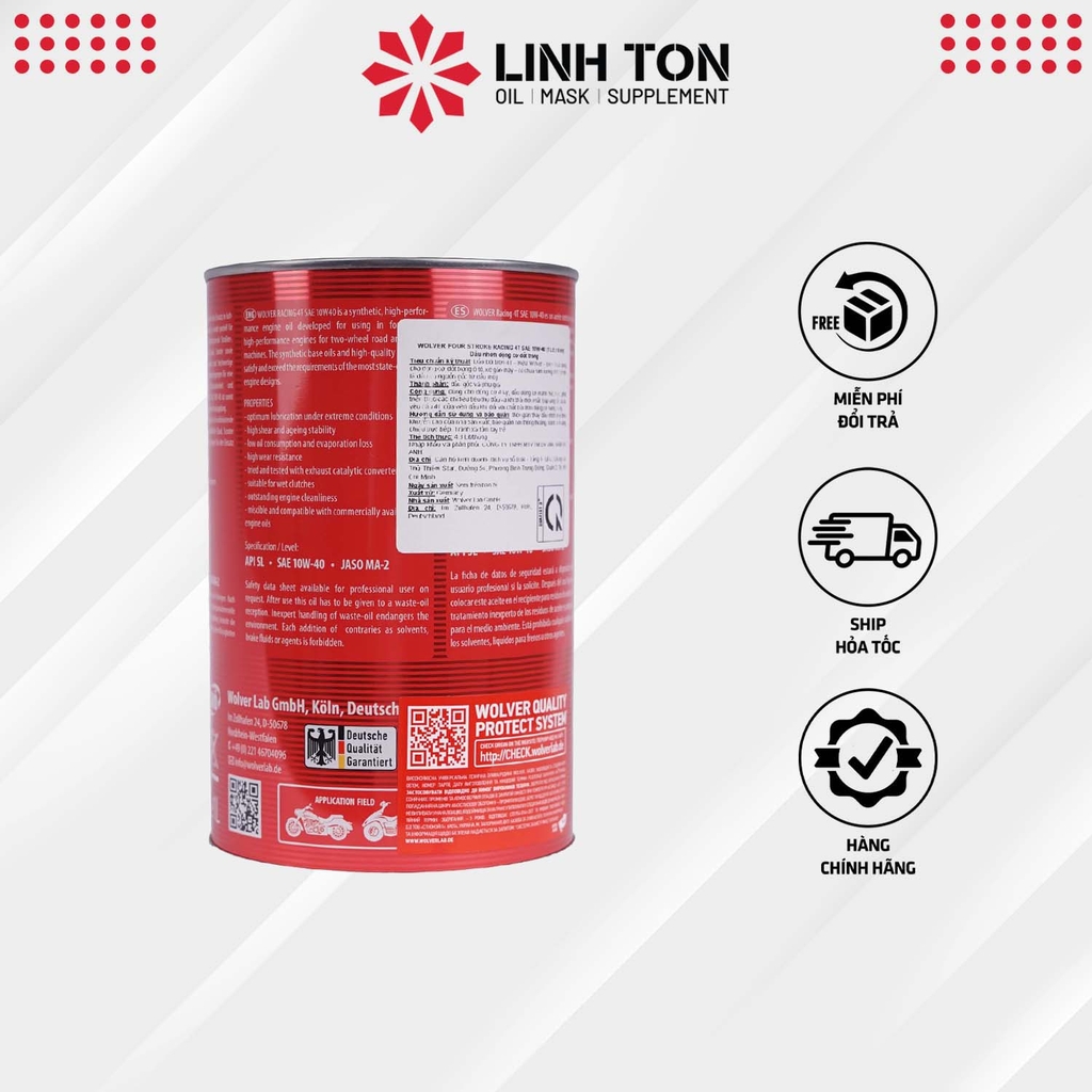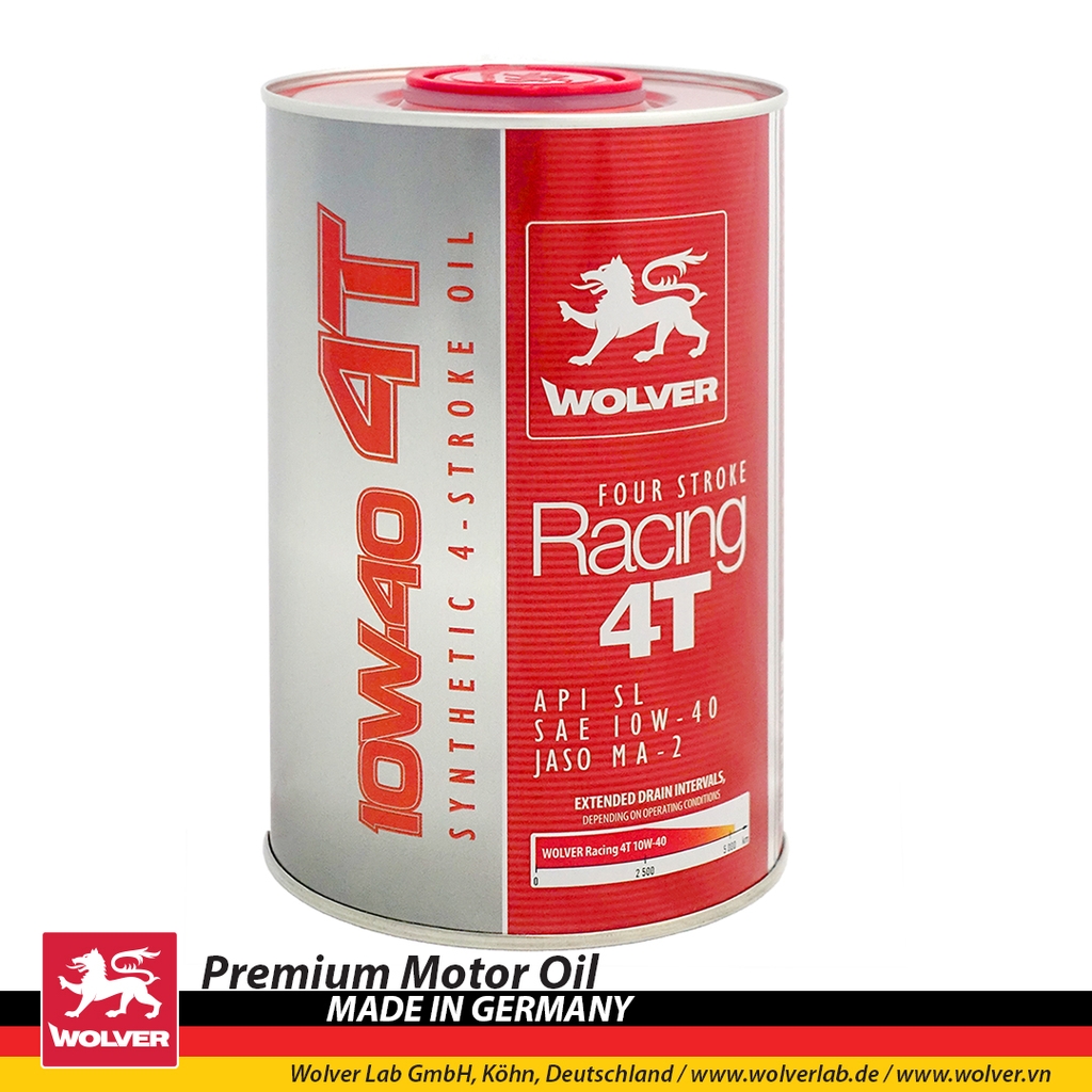 - Nhớt nhập khẩu Wolver Racing Synthetic 10W40 là một loại nhớt bôi trơn tổng hợp độc đáo, được thiết kế đặc biệt cho động cơ xe máy 4 thì, và được nhập khẩu chính hãng từ Đức.