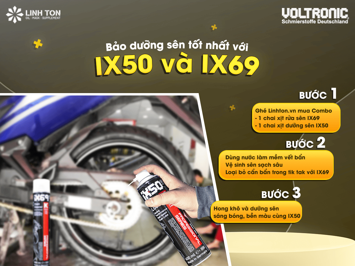 Để đạt được hiệu quả tốt nhất, bạn nên quan tâm đến việc bảo dưỡng bộ sên dĩa của xe bằng cách sử dụng cặp sản phẩm dưỡng sên Voltronic IX50 và IX69, được xem là tốt nhất hiện nay. Khi sử dụng xe trong thời gian dài, sên xe dĩa sẽ bị dính bẩn từ nước, khói bụi và đất cát, gây ra sét rỉ và tình trạng này trở nên nghiêm trọng hơn trong mùa mưa vì nước mưa có tính acid và sình lầy bám vào sên xe khó vệ sinh, dẫn đến hỏng hóc nghiêm trọng. Vì vậy, hãy cùngLinh Ton Store - đơn vị phân phối độc quyền các sản phẩm chính hãng VOLTRONIC và XADO tìm hiểu kĩ hơn về bộ sản phẩm này nhé